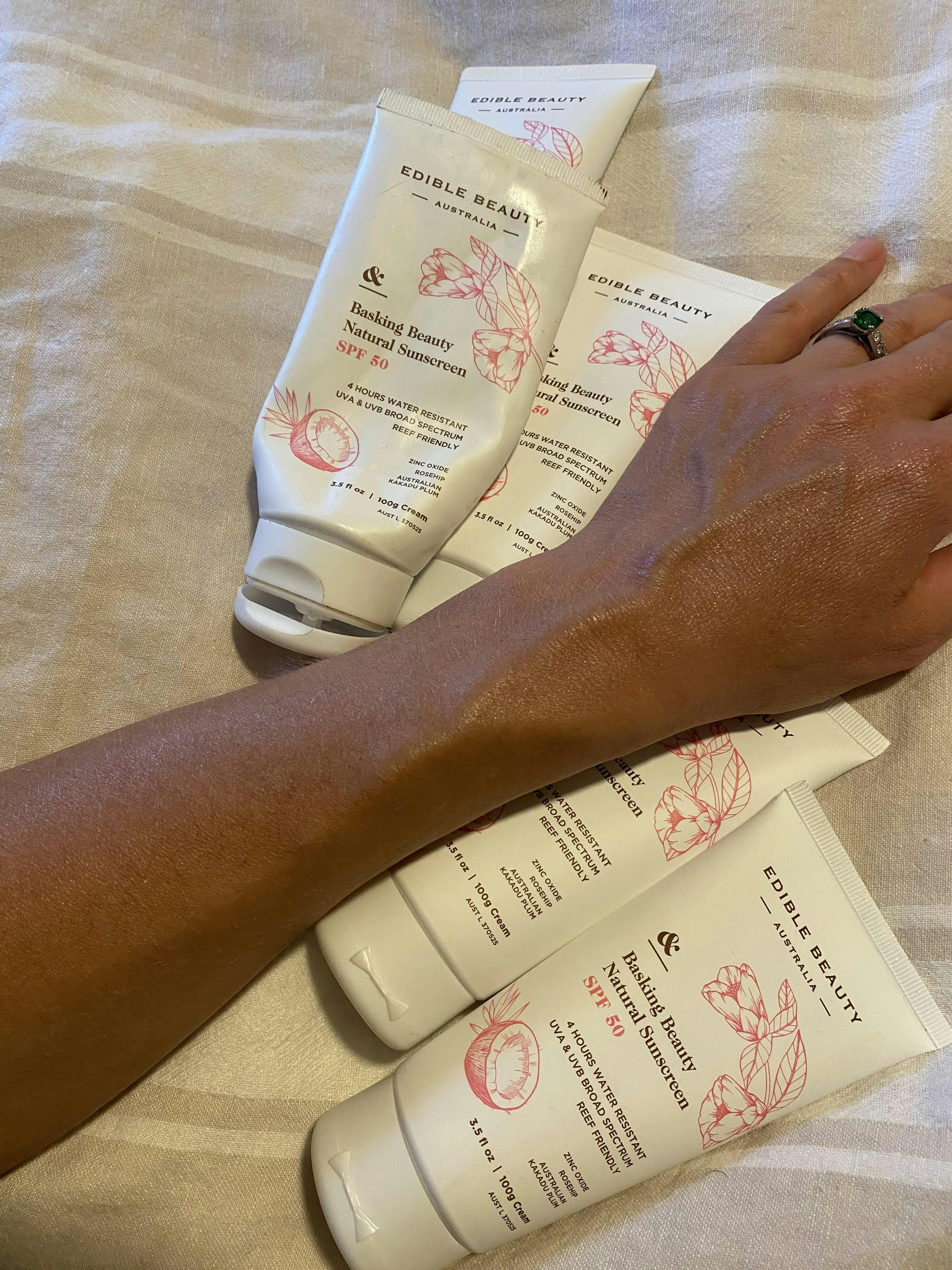 Basking Beauty Natural Sunscreen blends into your skin so it won’t leave a white residue. Suitable for all skin types.